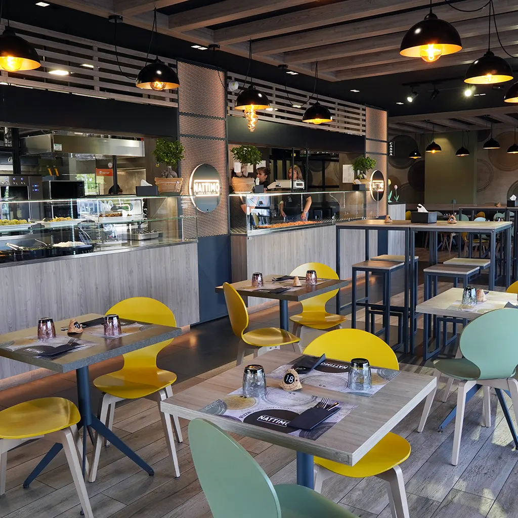 Si abbassano le luci, si accendono i punti luce sui singoli tavoli e si propone un menu ricco di piatti curati e sfiziosi. Nattimo Tor Vergata, coniuga un ambiente moderno e semplice, con un’atmosfera sofisticata, ma non pretenziosa. Un luogo per un aperitivo di lavoro o una pizza tra amici: ai tavoli alti con gli sgabelli che ispirano una pausa pranzo gustosa, ma veloce, si affiancano, senza darsi fastidio, i tavoli bassi con le sedie colorate. Un alternarsi di dettagli in legno e ferro che si prestano ad ogni occasione.